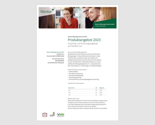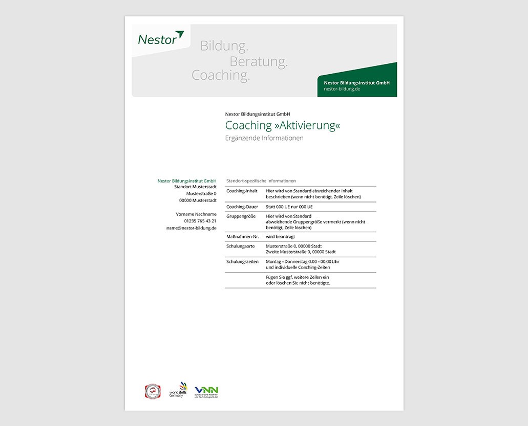 Auf der 2. Seite stehen die standortspezifischen Angaben (Kontakt, Schulungszeiten, Maßnahmennummer etc.) Diese kann mit MS-Word bearbeitet werden.