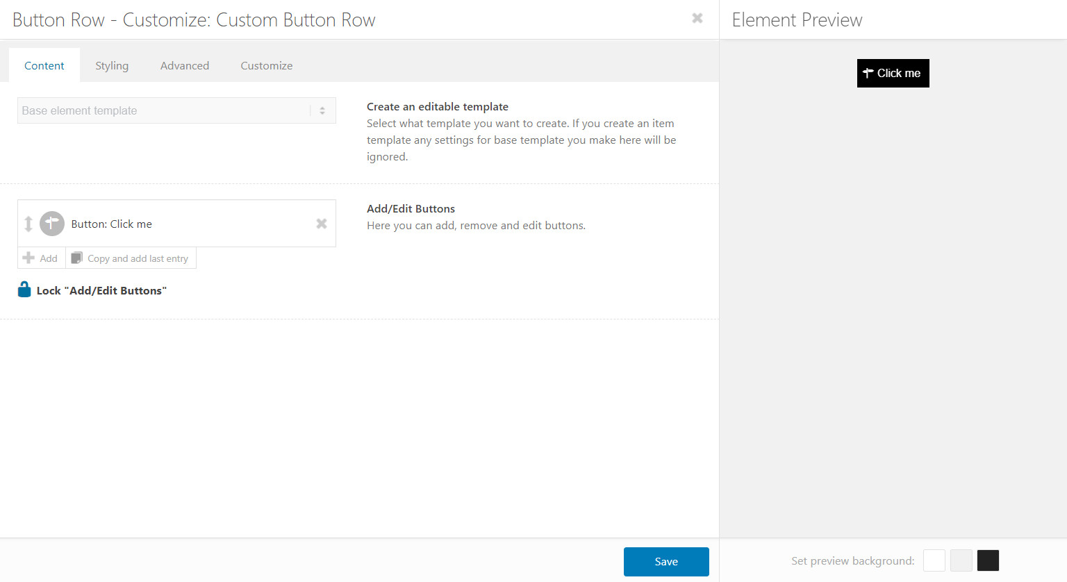 Diese Einstellungen und gesperrten Werte dienen als Grundlage für alle Schaltflächen, die Sie später einer Schaltflächenzeile hinzufügen, wenn Sie dieses CET auf einer Seite verwenden.