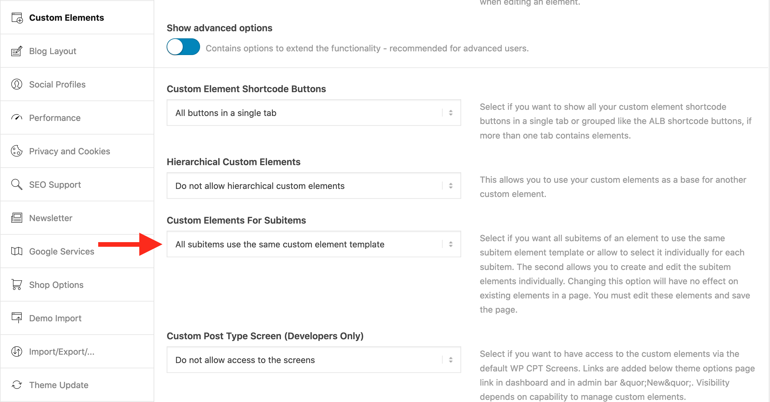 Benutzerdefinierte Elemente – Erweiterte Option: Benutzerdefinierte Elemente für Unterelemente
