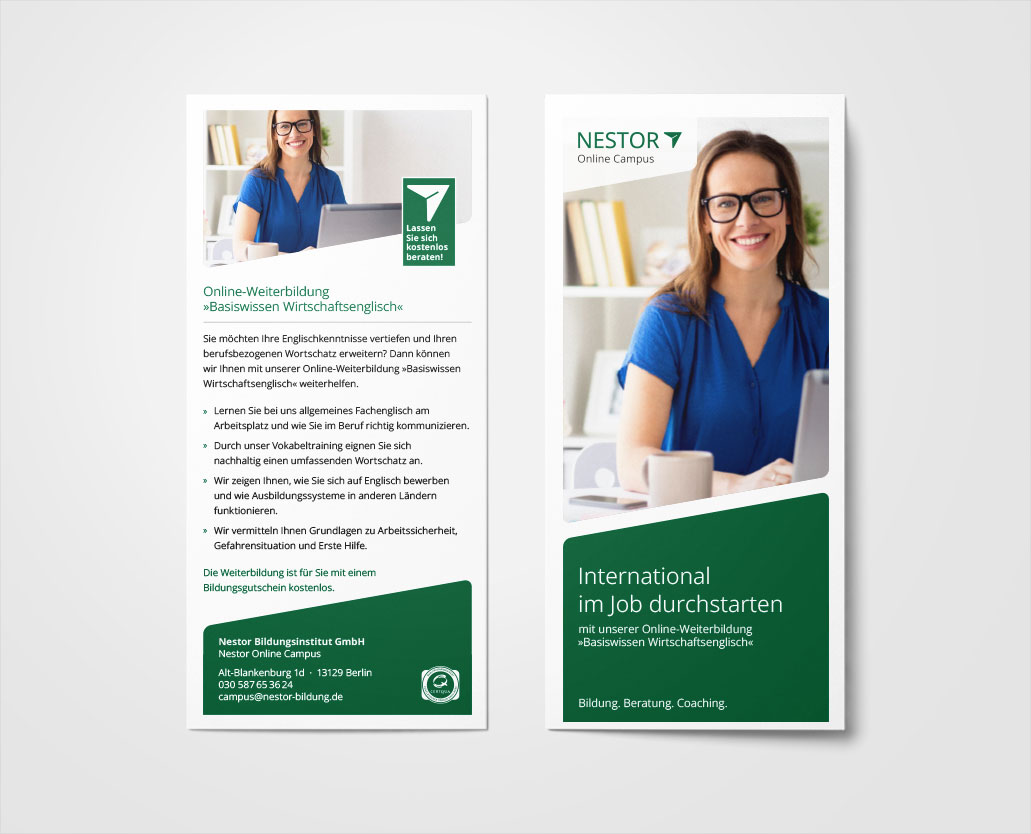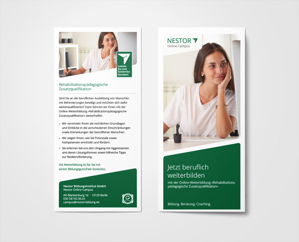 Für jedes Angebot des Nestor Online Campus ist ein Flyer vorhanden, in dem die Inhalte kurz und knapp aufbereitet sind. Die Flyer richten sich an Teilnehmer und können auf Messen, an den Standorten oder bei Netzwerktreffen eingesetzt werden.
