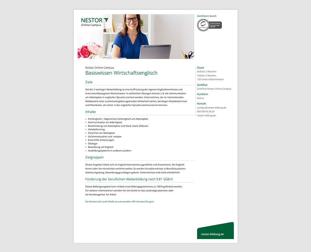Die Produktmappe enthält ausführliche Informationen zu den jeweiligen Kursen des Nestor Online Campus und dient in erster Linie für die Kommunikation mit öffentlichen Einrichtungen.